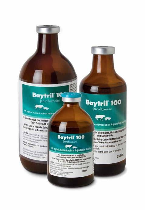 Available in three convenient sizes. Baytril 100 lets you select the bottle size that best fits your needs. Look for it in the 100 mL, 250 mL and 500 mL amber glass bottles.